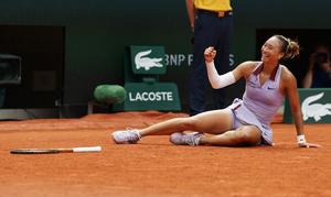 (250601) -- PARÍS, 1 junio, 2025 (Xinhua) -- Zheng Qinwen festeja después de la cuarta ronda de individuales femeninos entre...