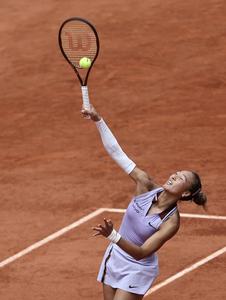(250601) -- PARÍS, 1 junio, 2025 (Xinhua) -- Zheng Qinwen devuelve la pelota durante el partido de cuarta ronda de...