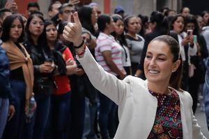 (250601) -- CIUDAD DE MEXICO, 1 junio, 2025 (Xinhua) -- La presidenta de México, Claudia Sheinbaum, muestra su pulgar después...