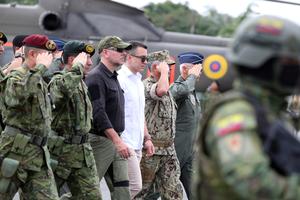 (250602) — GUAYAQUIL, 2 junio, 2025 (Xinhua) — Imagen cedida por la Presidencia de Ecuador del presidente ecuatoriano, Daniel Noboa (3-d), caminando junto al ministro de Defensa de Ecuador, Gian Carlo Loffredo (3-i), durante la entrega de dos helicópteros multipropósito Airbus H225, en Guayaquil, Ecuador, el 2 de junio de 2025. Noboa entregó el lunes al Ejército dos helicópteros multipropósito Airbus H225 fabricados en Francia, para fortalecer su capacidad operativa en tareas de seguridad, rescate y atención humanitaria, informó el Gobierno. (Xinhua/Carlos Silva/Presidencia de Ecuador) (rtg) (oa) (ce)