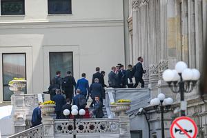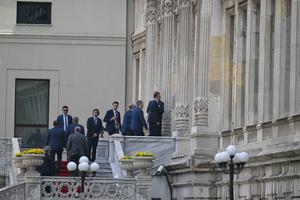 (250602) -- ESTAMBUL, 2 junio, 2025 (Xinhua) -- Miembros de la delegación ucraniana ingresan al Palacio de Ciragan, en Estambul,...