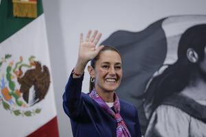 (250602) -- CIUDAD DE MEXICO, 2 junio, 2025 (Xinhua) -- La presidenta de México, Claudia Sheinbaum, saluda durante su conferencia...