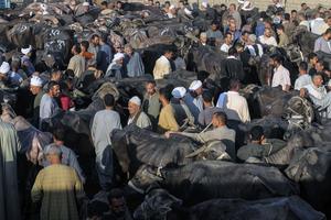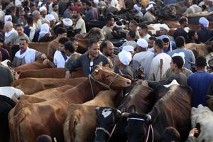 (250602) -- GIZA, 2 junio, 2025 (Xinhua) -- Vendedores y compradores intercambian ganado en un mercado de ganado previo al...