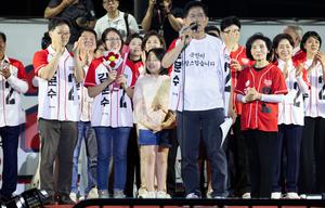 (250602) -- SEUL, 2 junio, 2025 (Xinhua) -- Kim Moon-soo (c), candidato presidencial por el Partido del Poder Popular, habla...