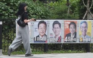 (250602) -- SEUL, 2 junio, 2025 (Xinhua) -- Una mujer camina frente a carteles de campaña de los candidatos presidenciales,...