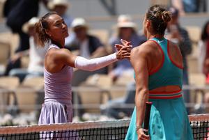 (250603) -- PARÍS, 3 junio, 2025 (Xinhua) -- Zheng Qinwen (i), de China, y Aryna Sabalenka, de Bielorrusia, se saludan...