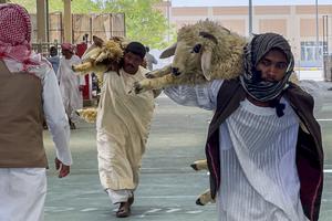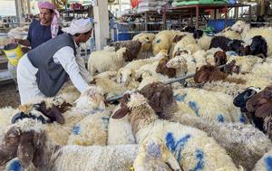 (250603) -- DOHA, 3 junio, 2025 (Xinhua) -- Vendedores cargan ovejas en un mercado de ganado previo al Eid al-Adha,...