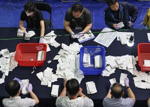 (250603) -- SEÚL, 3 junio, 2025 (Xinhua) -- Trabajadores laboran en una estación de conteo para las elecciones presidenciales de...