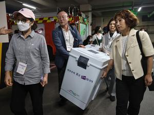 (250603) -- SEÚL, 3 junio, 2025 (Xinhua) -- Trabajadores transportan papeletas de las elecciones presidenciales de la República de Corea,...