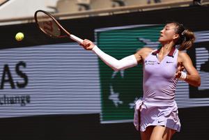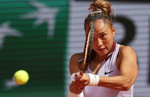 (250603) -- PARÍS, 3 junio, 2025 (Xinhua) -- Zheng Qinwen devuelve la pelota durante los cuartos de final de individuales...