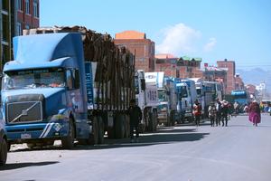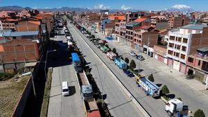 (250603) -- EL ALTO, 3 junio, 2025 (Xinhua) -- Vista aérea tomada con un dron de camiones esperando en fila...