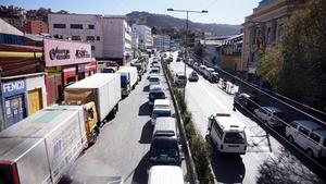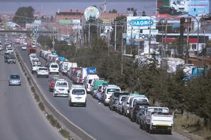 (250603) -- EL ALTO, 3 junio, 2025 (Xinhua) -- Camiones esperan en fila para cargar combustible en una calle, en...
