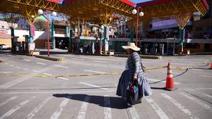 (250603) -- LA PAZ, 3 junio, 2025 (Xinhua) -- Una mujer camina frente a una estación de servicio, en La...