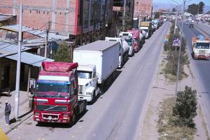 (250603) -- LA PAZ, 3 junio, 2025 (Xinhua) -- Camiones esperan en fila para cargar combustible en una calle, en...