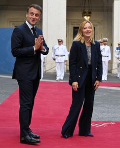 (250603) -- ROMA, 3 junio, 2025 (Xinhua) -- La primera ministra italiana, Giorgia Meloni (d), recibe al presidente francés, Emmanuel...