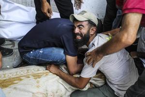 (250603) -- GAZA, 3 junio, 2025 (Xinhua) -- Un hombre palestino se lamenta por una víctima asesinada en un ataque...