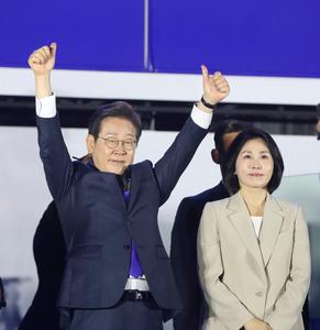 (250603) -- SEÚL, 4 junio, 2025 (Xinhua) -- Lee Jae-myung y su esposa, Kim Hye-kyung, festejan en la Asamblea Nacional,...