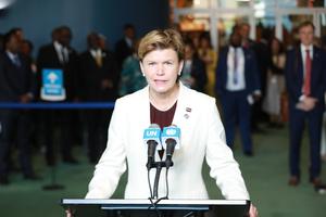 (250603) -- NACIONES UNIDAS, 3 junio, 2025 (Xinhua) -- La ministra de Relaciones Exteriores letona, Baiba Braze, habla con la...