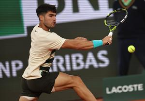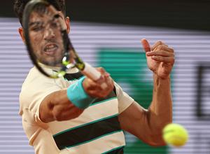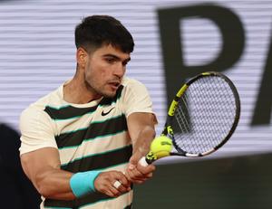 (250604) -- PARIS, 4 junio, 2025 (Xinhua) -- Imagen del 3 de junio de 2025 de Carlos Alcaraz devolviendo la...