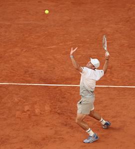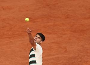 (250604) -- PARIS, 4 junio, 2025 (Xinhua) -- Imagen del 3 de junio de 2025 de Carlos Alcaraz sirviendo la...