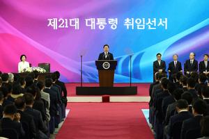 (250604) -- SEUL, 4 junio, 2025 (Xinhua) -- Lee Jae-myung presta juramento del cargo en el edificio de la Asamblea...