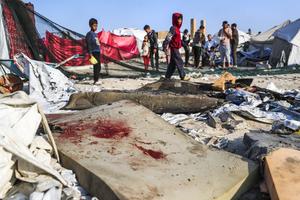(250604) -- GAZA, 4 junio, 2025 (Xinhua) -- Palestinos inspeccionan una tienda de campaña dañada después de un ataque aéreo...