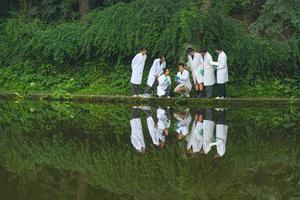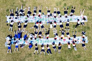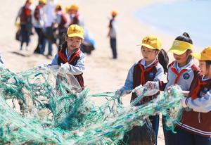 (250604) -- BEIJING, 4 junio, 2025 (Xinhua) -- Estudiantes de primaria limpian la basura en el parque Binhai, en la...