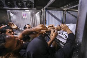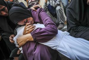 (250604) -- GAZA, 4 junio, 2025 (Xinhua) -- Palestinos se lamentan por una víctima asesinada en un ataque aéreo israelí,...