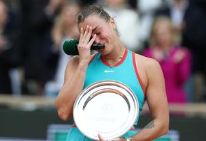 (250608) -- PARIS, 8 junio, 2025 (Xinhua) -- Imagen del 7 de junio de 2025 de Aryna Sabalenka reaccionando durante...