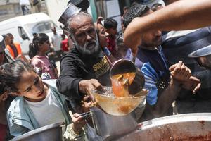(250608) -- GAZA, 8 junio, 2025 (Xinhua) -- Imagen del 7 de junio de 2025 de palestinos recibiendo alimentos gratuitos...