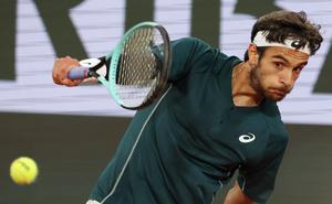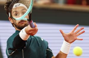 (250606) -- PARIS, 6 junio, 2025 (Xinhua) -- Lorenzo Musetti devuelve la pelota durante la semifinal de individuales masculinos entre...
