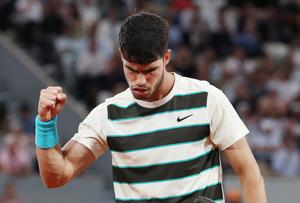 (250606) -- PARIS, 6 junio, 2025 (Xinhua) -- Carlos Alcaraz festeja un punto durante la semifinal de individuales masculinos entre...