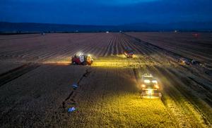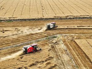 (250606) -- BEIJING, 6 junio, 2025 (Xinhua) -- Imagen del 4 de junio de 2025 de cosechadoras segando trigo en...