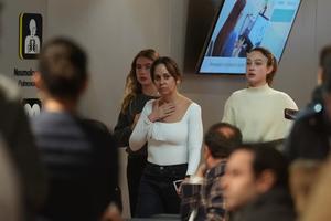 (250608) -- BOGOTA, 8 junio, 2025 (Xinhua) -- La esposa de Miguel Uribe Turbay, Claudia Tarazona (c), reacciona mientras espera...