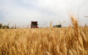 (250606) -- BEIJING, 6 junio, 2025 (Xinhua) -- Imagen del 5 de junio de 2025 de una cosechadora segando trigo...