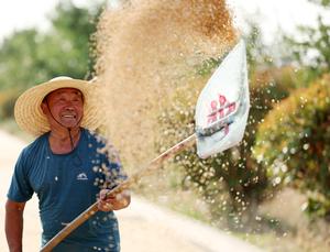 (250606) -- BEIJING, 6 junio, 2025 (Xinhua) -- Imagen del 4 de junio de 2025 de un agricultor aireando trigo...