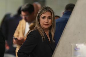 (250608) -- BOGOTA, 8 junio, 2025 (Xinhua) -- La precandidata a la Presidencia de Colombia, Vicky Dávila, reacciona mientras espera...