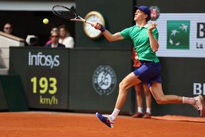 (250608) -- PARIS, 8 junio, 2025 (Xinhua) -- Jannik Sinner devuelve la pelota durante la final de individuales masculinos entre...