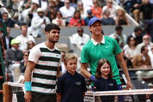 (250608) -- PARIS, 8 junio, 2025 (Xinhua) -- Carlos Alcaraz (i) y Jannik Sinner (d) posan para fotografías previo a...