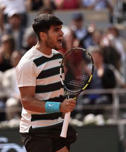 (250608) -- PARIS, 8 junio, 2025 (Xinhua) -- Carlos Alcaraz festeja un punto durante la final de individuales masculinos entre...
