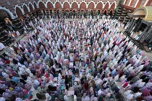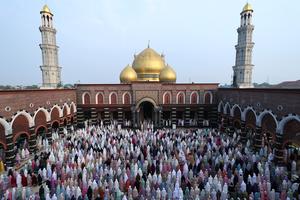 (250606) -- DEPOK, 6 junio, 2025 (Xinhua) -- Personas ofrecen oraciones de Eid al-Adha en la mezquita Dian Al-Mahri, en...