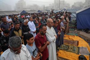 (250606) -- GAZA, 6 junio, 2025 (Xinhua) -- Palestinos desplazados ofrecen oraciones del Eid al-Adha afuera de sus refugios temporales,...