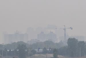 (250606) -- TORONTO, 6 junio, 2025 (Xinhua) -- Edificios están envueltos en humo de un incendio forestal, en Toronto, Canadá,...