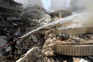 (250606) -- BEIRUT, 6 junio, 2025 (Xinhua) -- Un bombero trabaja en el sitio de ataques aéreos israelíes, en el...