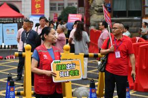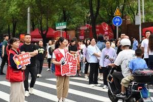 (250608) -- CHANGSHA, 8 junio, 2025 (Xinhua) -- Una voluntaria mantiene el orden frente a un sitio del examen nacional...