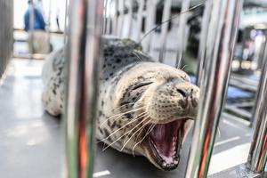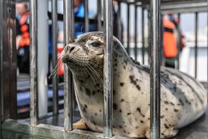 (250606) -- DALIAN, 6 junio, 2025 (Xinhua) -- Una foca moteada es vista previo a ser liberada, en Dalian, en...