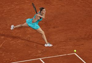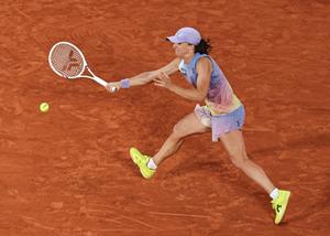 (250606) -- PARIS, 6 junio, 2025 (Xinhua) -- Imagen del 5 de junio de 2025 de Iga Swiatek devolviendo la...
