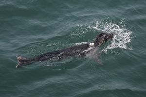 (250606) -- DALIAN, 6 junio, 2025 (Xinhua) -- Una foca moteada recién liberada nada en las aguas frente a Dalian,...