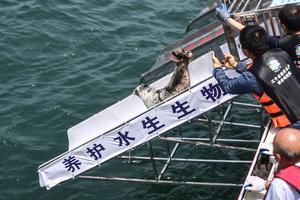 (250606) -- DALIAN, 6 junio, 2025 (Xinhua) -- Una foca moteada es liberada en las aguas frente a Dalian, en...