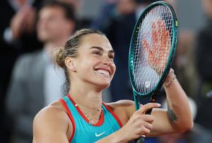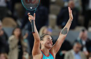 (250606) -- PARIS, 6 junio, 2025 (Xinhua) -- Imagen del 5 de junio de 2025 de Aryna Sabalenka festejando después...